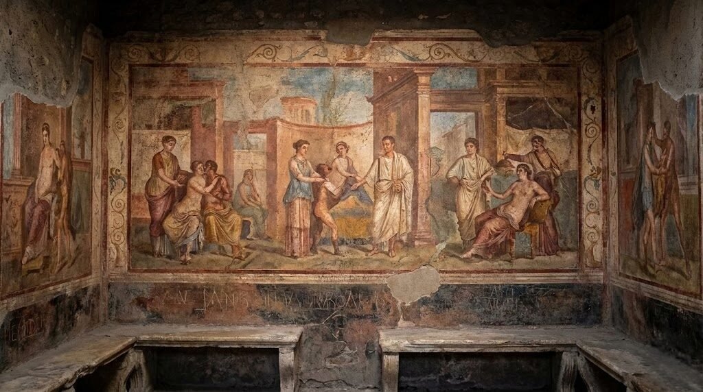 Les lupanars de Pompéi, ensevelis en 79 de notre ère et fouillés depuis le XVIIIe siècle, montrent des cellules de quelques mètres carrés avec des lits en pierre. Les fresques érotiques servaient de menu visuel. Les prix, gravés sur les murs, démarrent à 2 as – le prix d’un litre de vin ordinaire. Les prostituées sont majoritairement des esclaves ou des affranchies.