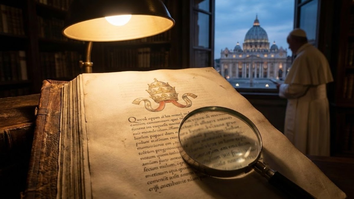 Gros plan sur un manuscrit ancien évoquant la prophétie des papes avec une loupe, en arrière-plan le Pape Léon XIV regarde la Place Saint-Pierre depuis une fenêtre du Vatican au crépuscule.